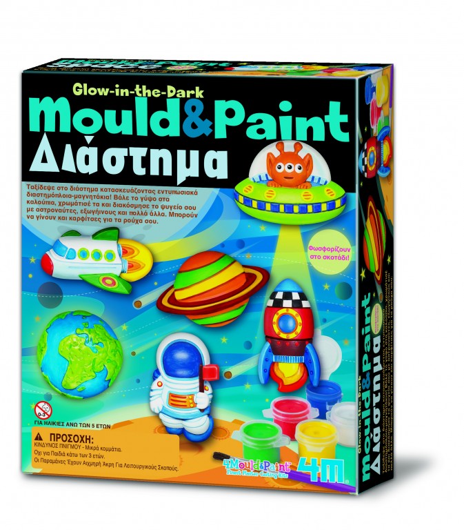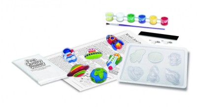 ΠΑΡΑΣΚΕΥΗ: Προετοίμασε το μείγμα του γύψου, ακολουθώντας πιστά τις οδηγίες όπως αναγράφονται στη συσκευασία. Ρίξε το μείγμα του γύψου στα καλούπια και ανακίνησε τα ελαφρά. Άφησε τον γύψο να στερεοποιηθεί για λίγη ώρα και ζωγράφισε τις διαστημικές φιγούρες με τα χρώματα που περιλαμβάνονται.